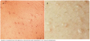 Gambar 2. Penampakan Milia rubra (A), Miliaria crystallina (B)(Mayo Clinic, 2022)